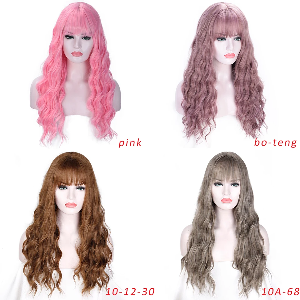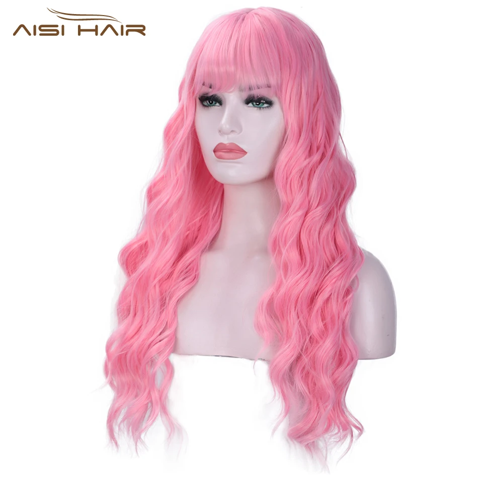 I's a wig Pink Wigs with Bangs Long Water Wave Synthetic Wigs for Women African American can be Cos