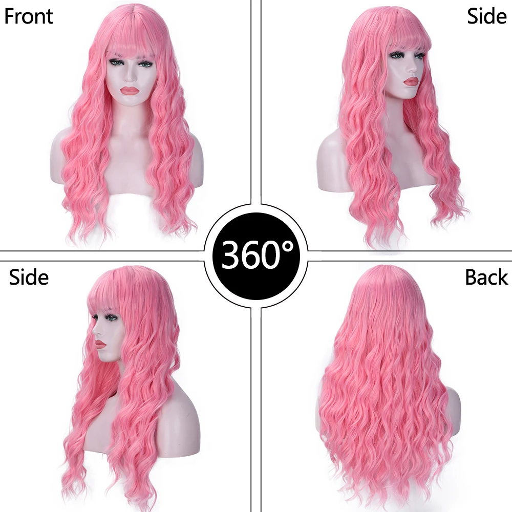 TOP I's a wig Pink Wigs with Bangs Long Water Wave Synthetic Wigs for Women African American can be Cos