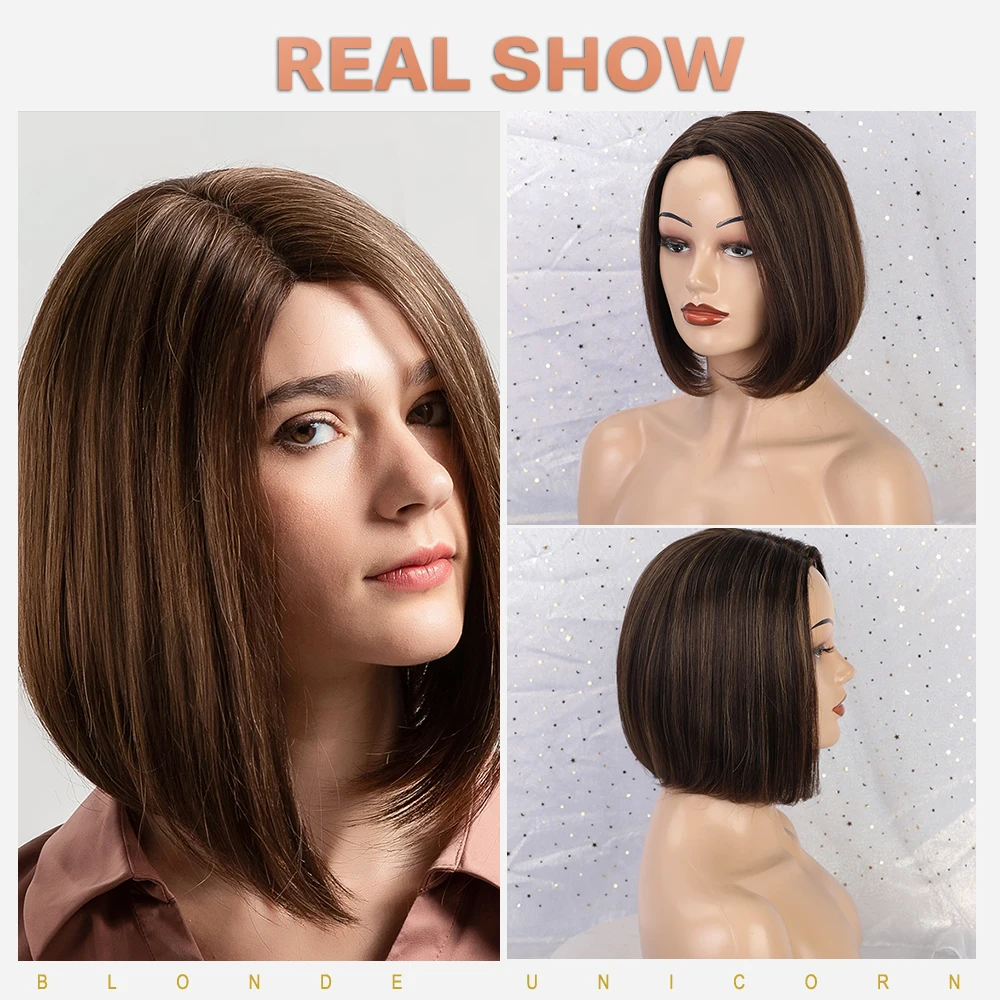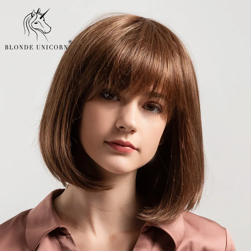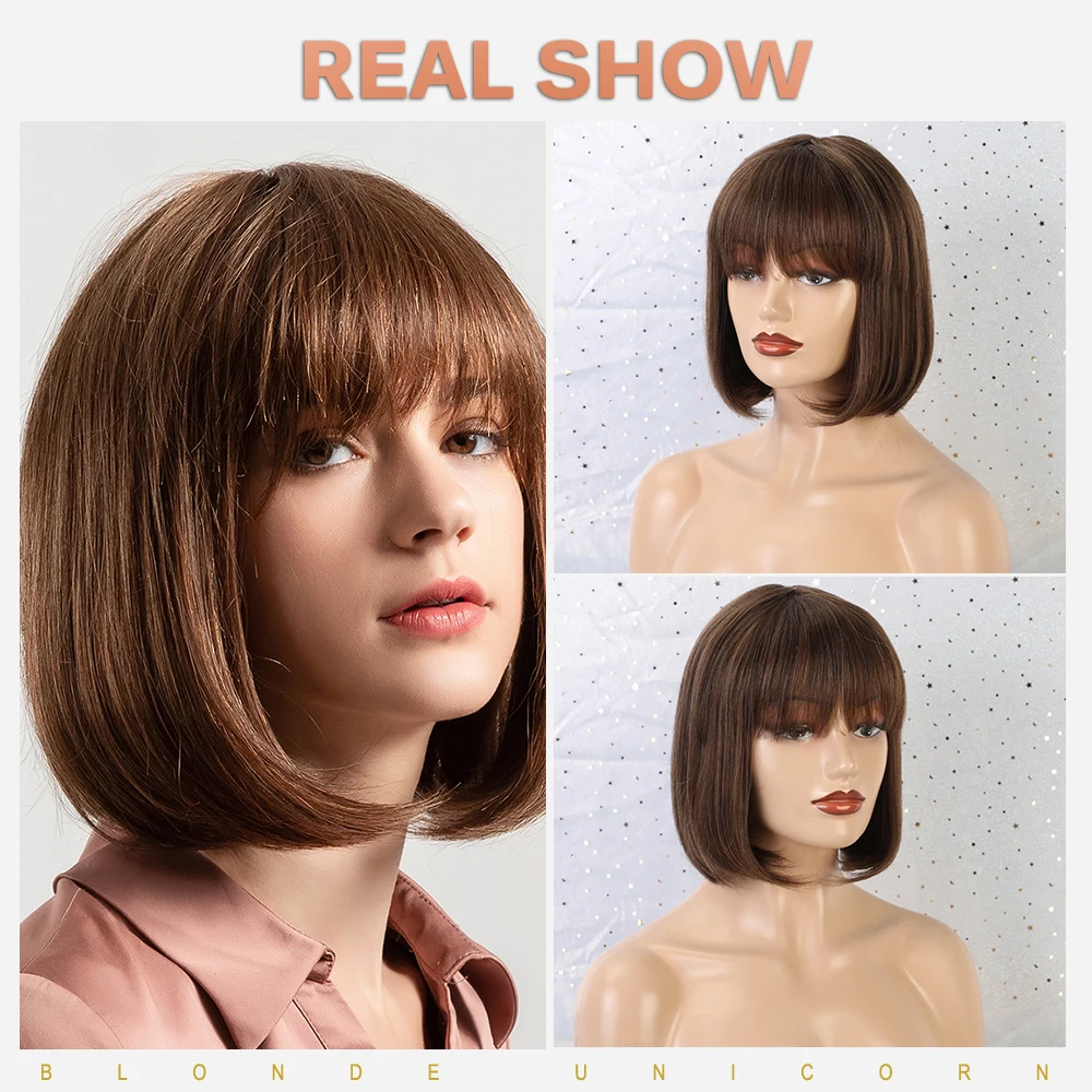 Blonde Unicorn 10 inches Synthetic Short Straight Brown Bob Style Wigs with Bangs 50% Human Hair Wo