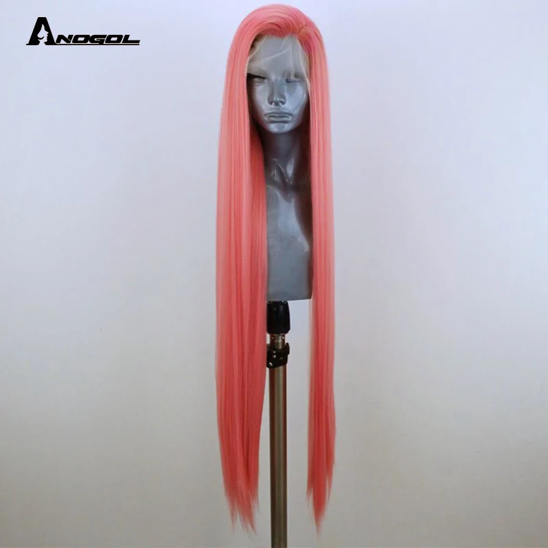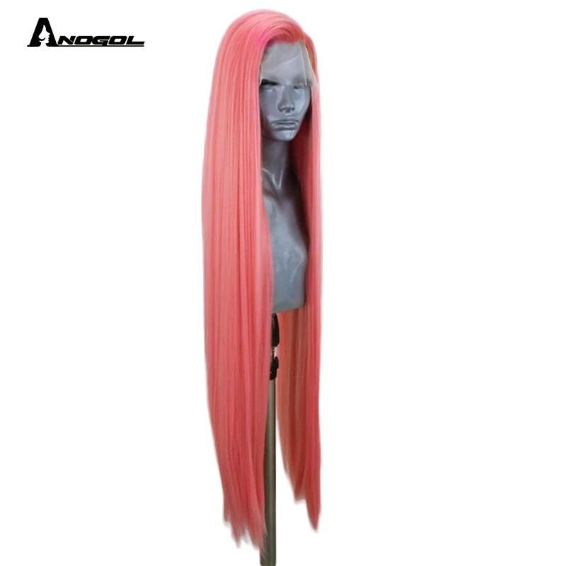 BEST QUALITY Anogol Strawberry Pastel- Pink High Temperature Fiber Long Natural Straight Synthetic Lace Front Wi