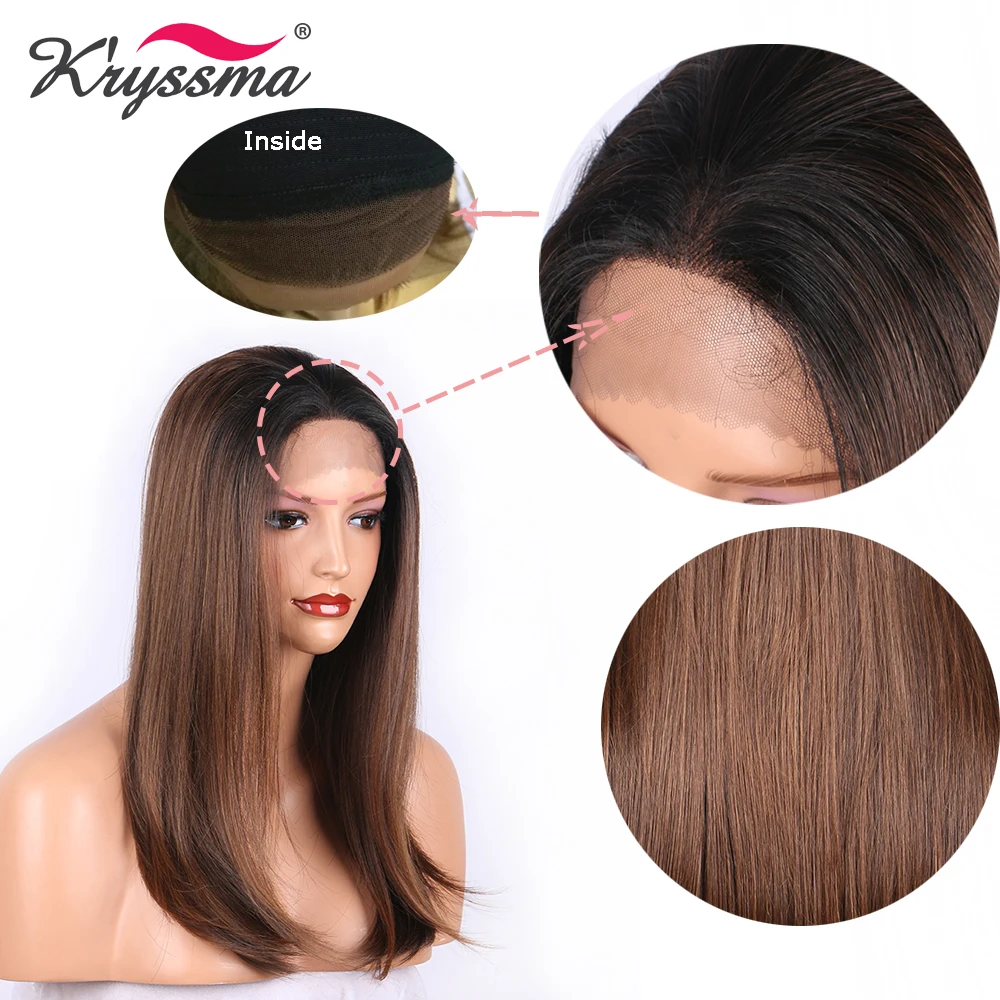 Brown Synthetic Lace Front Wig Natural Straight Two Tones Ombre Wigs for Women Black Roots Free Par