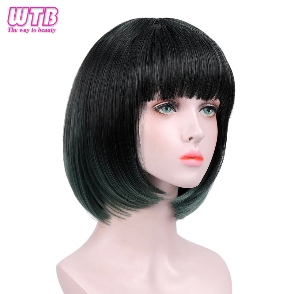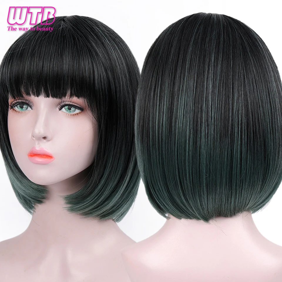 HIGH QUALITY WTB Black Top Dark Green Bottom Straight Ombre Wig with Bangs for Women Short Bob Heat Resistant Sy
