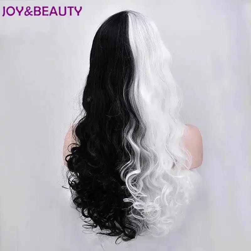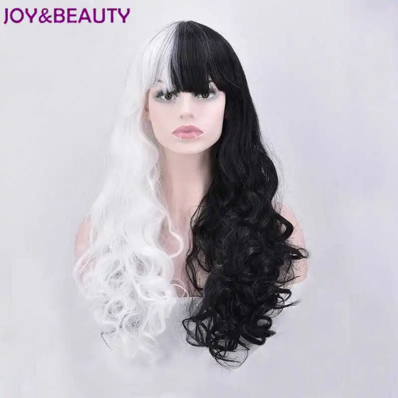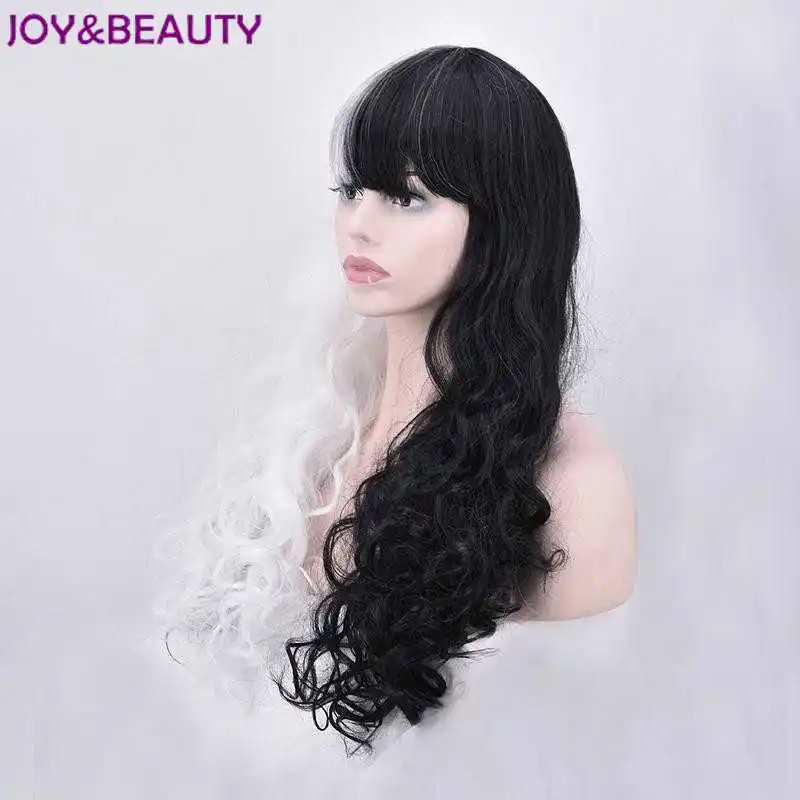 Best Quality JOY&BEAUTY 70cm Half White and Black Flat Bangs Heat Resistance Long Wavy Synthetic Hair Party Cosp