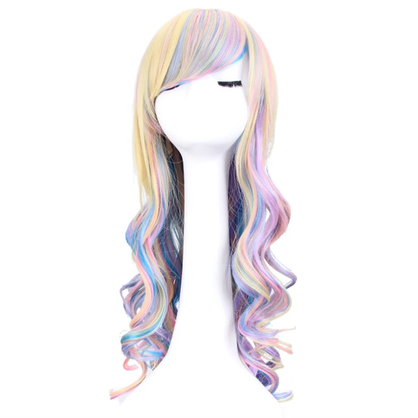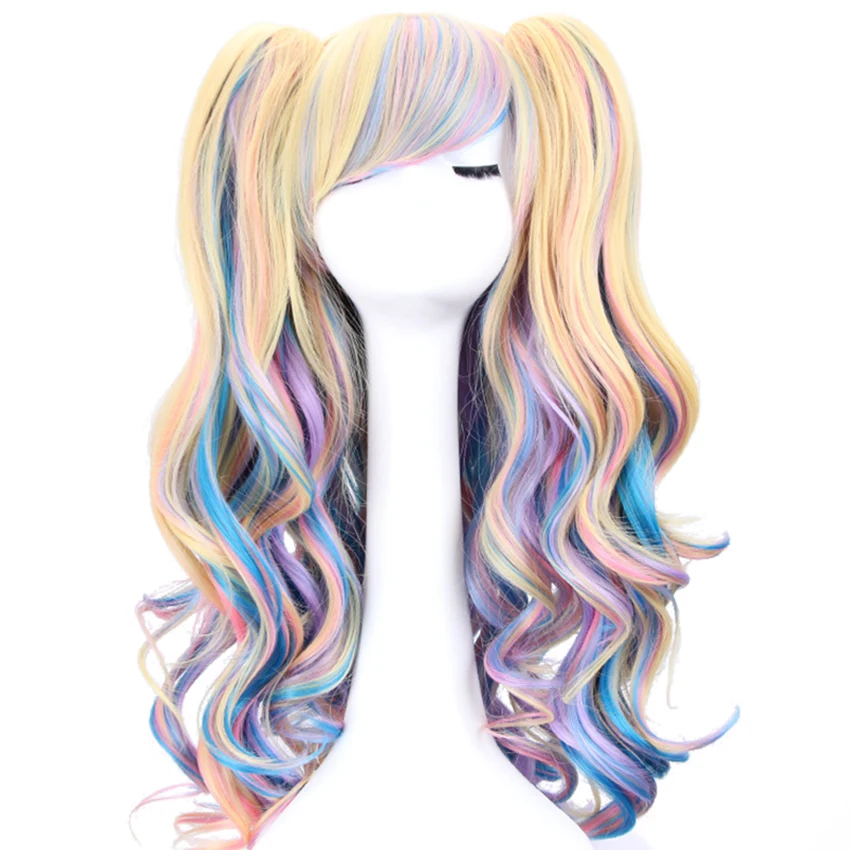 Best Quality Long Wavy Cosplay Lolita Wig Blue Blonde Pink Ombre Two Ponytails Synthetic Hair Girls Heat Resista